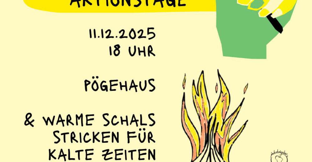 Wir laden euch herzlich zur nächsten Küfa am 11.12.2025 um 18 uhr im Pöge-Haus ein. Ab 19 Uhr wollen wir gemeinsam über die Aktionstage gegen die Fruit Logistica sprechen. Bei leckerem Essen mit dem Gemüse von Leipziger Solawis können auch deine Hände aktiv werden. Wir bringen Stricknadeln, Wolle und Anleitungen für Schals mit, denn die Aktionstage finden nächstes Jahr am 05.02 und 06.02. in Berlin statt und wie du weißt, ist es da kalt.