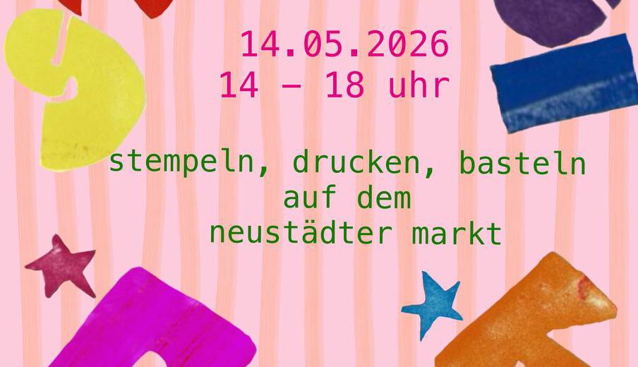 Kommt stattdessen zum Stempelfest auf dem Neustädter Markt und lasst eurer Kreativität freien Lauf. Bei uns könnt ihr einen Nachmittag lang verschiedene Druck- und Stempeltechniken ausprobieren, stempeln, was das Zeug hält und ein paar schöne, kreative Stunden erleben.