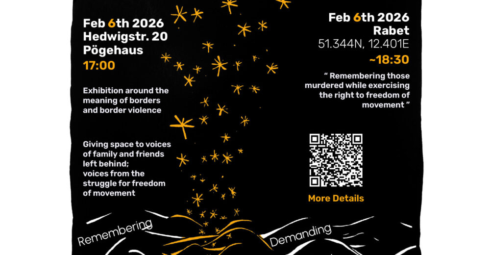The commemorAction will take place in two parts: In Pögehaus there will be a space to listen to both voices of the families and friends left behind and voices from the onging struggle for freedom of movemement. Later, there will be an outdoor part in Rabet to remember and commemorate together.