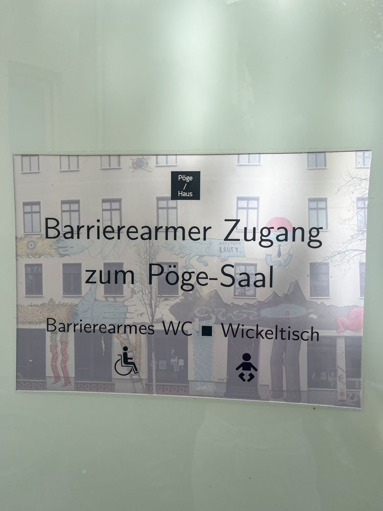 - barrierearmer Zugang zu Saal und Café, barrierearmes WC (der Seminarraum ist leider nur über zwei Treppenstufen zugänglich)